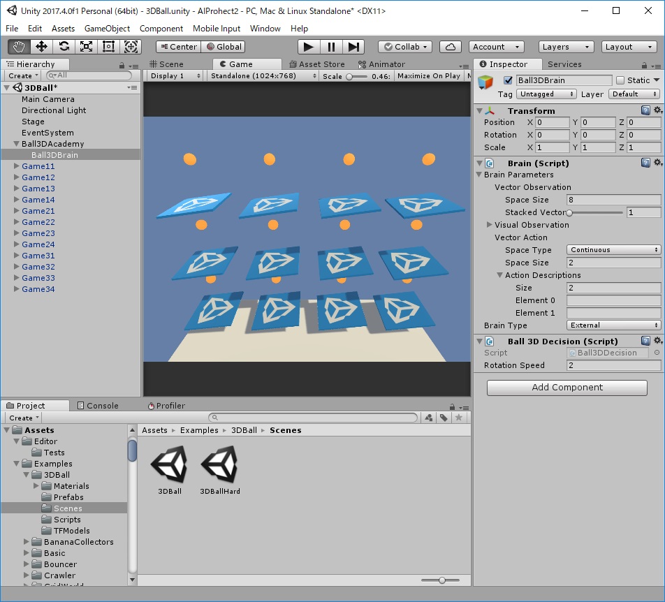 12.[Hierarchy]から[Ball3DAcademy]->[Ball3DBrain]を選択、[Inspector]から[Brain]->[BrainType]を[External]に変更