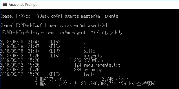 8.[ml-agents]のディレクトリの中にある[mlagents]フォルダーがある場所まで[Anaconda Prompt]で移動します。